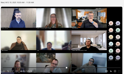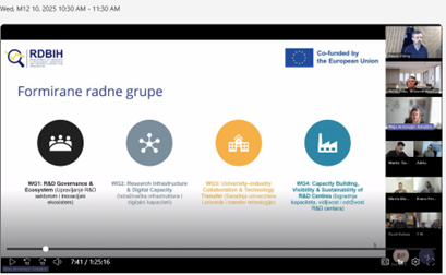 Dana 10. decembra 2025. godine održani su online sastanci radnih grupa WG1 – Upravljanje R&D sektorom i inovacijski ekosistem i WG2 – Istraživačka infrastruktura i digitalne sposobnosti, dok su 12. decembra 2025. godine održani sastanci WG3 – Saradnja univerziteta i privrede i transfer tehnologije i WG4 – Izgradnja kapaciteta, vidljivost i održivost R&D centara. Na sastancima su učestvovali predstavnici svih projektnih partnera, kao i dodatni predstavnici fokalnih univerziteta, relevantnih ministarstava na entitetskom i kantonalnom nivou, predstavnici privrede i predstavnici drugih aktera R&D ekosistema.